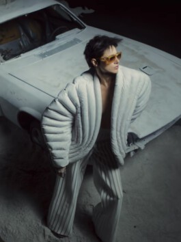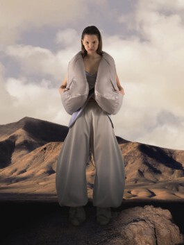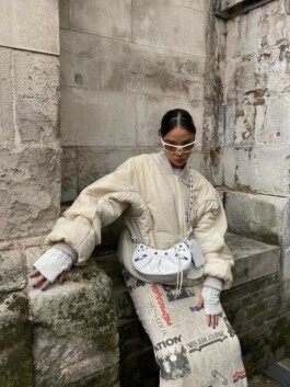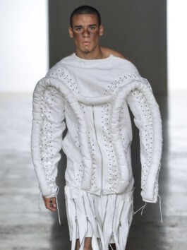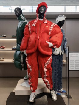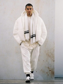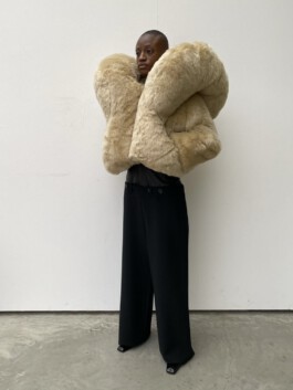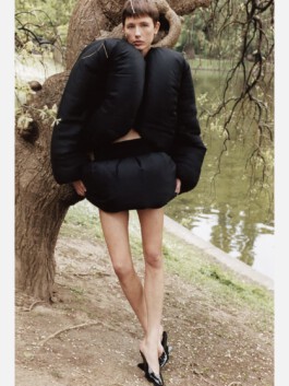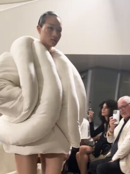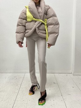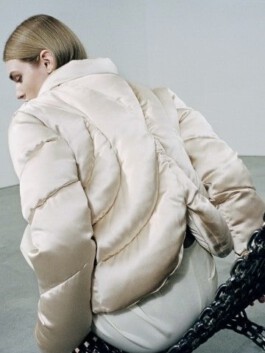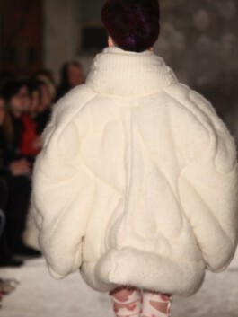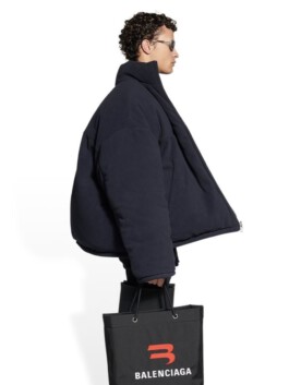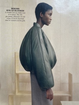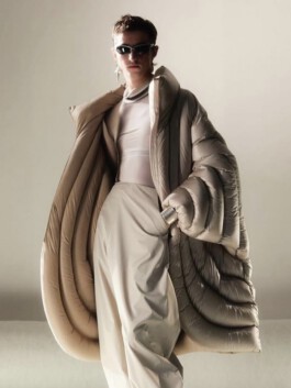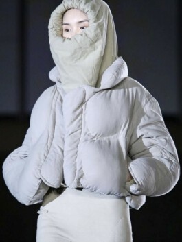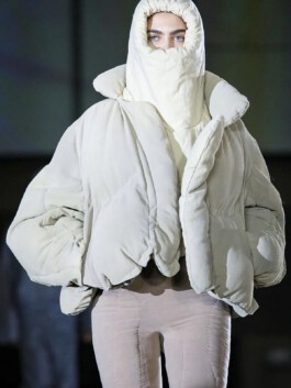 The jacket mobilises excess of volume, weight and insulation as a scenographic strategy. Rather than enhancing the body, it displaces it. Labour is not made visible through transparency; instead, it becomes perceptible through material density and disproportion. In this sense, invisibility in fashion appears not as an accident, but as a structural condition.
